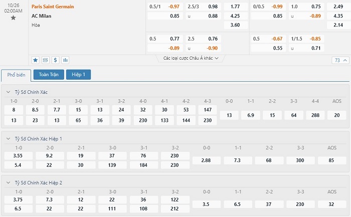 Xem tỷ lệ kèo cá cược bóng đá trực tuyến   Paris SG vs AC Milan