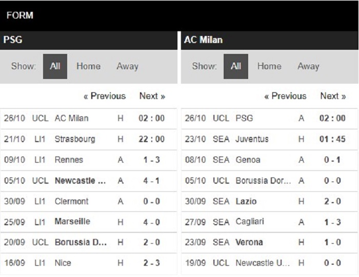 Thống kê phong độ   Paris SG vs AC Milan