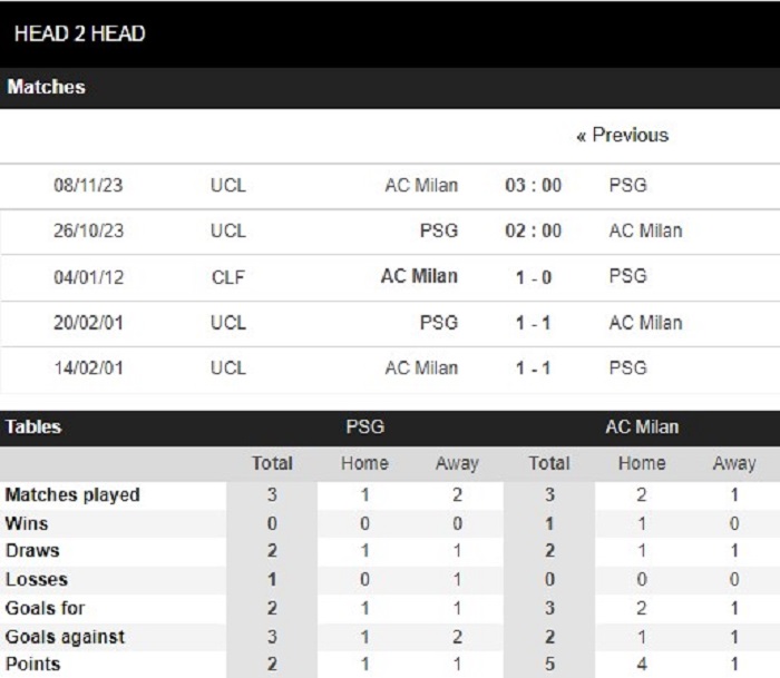Thống kê đối đầu   Paris SG vs AC Milan